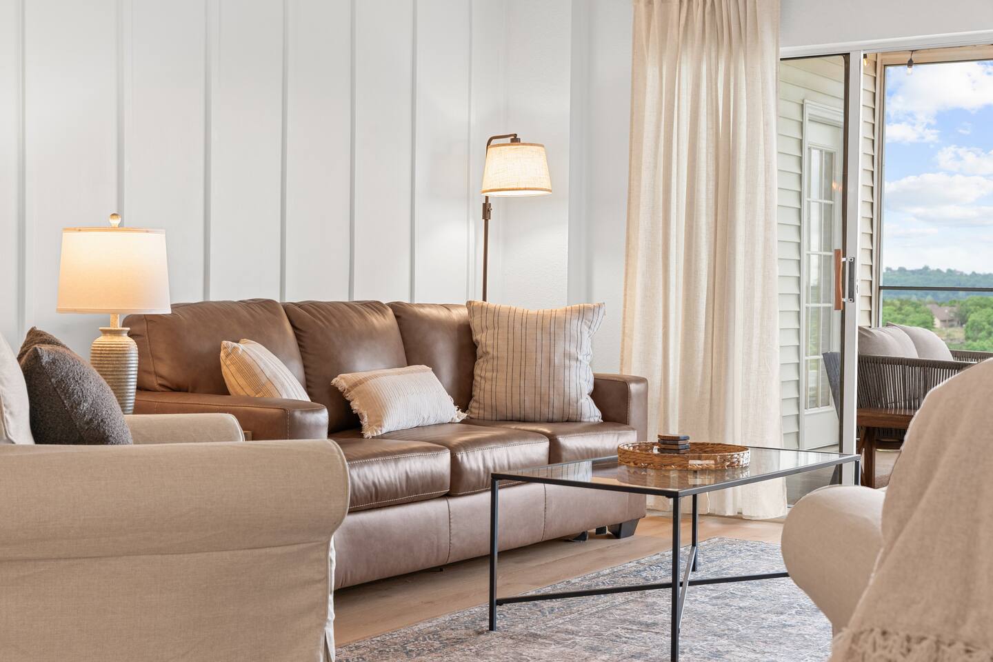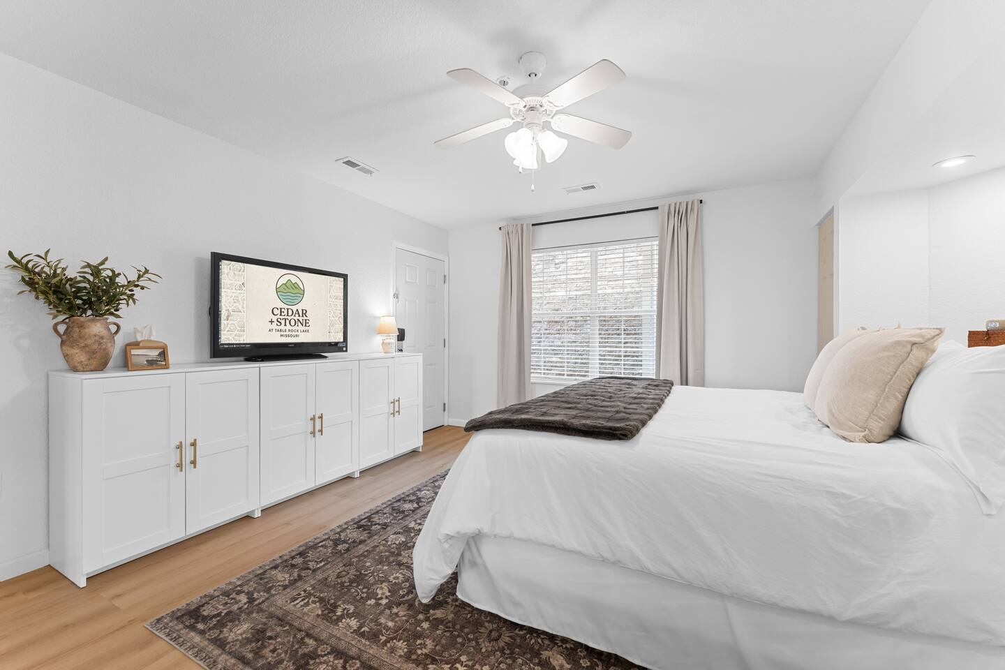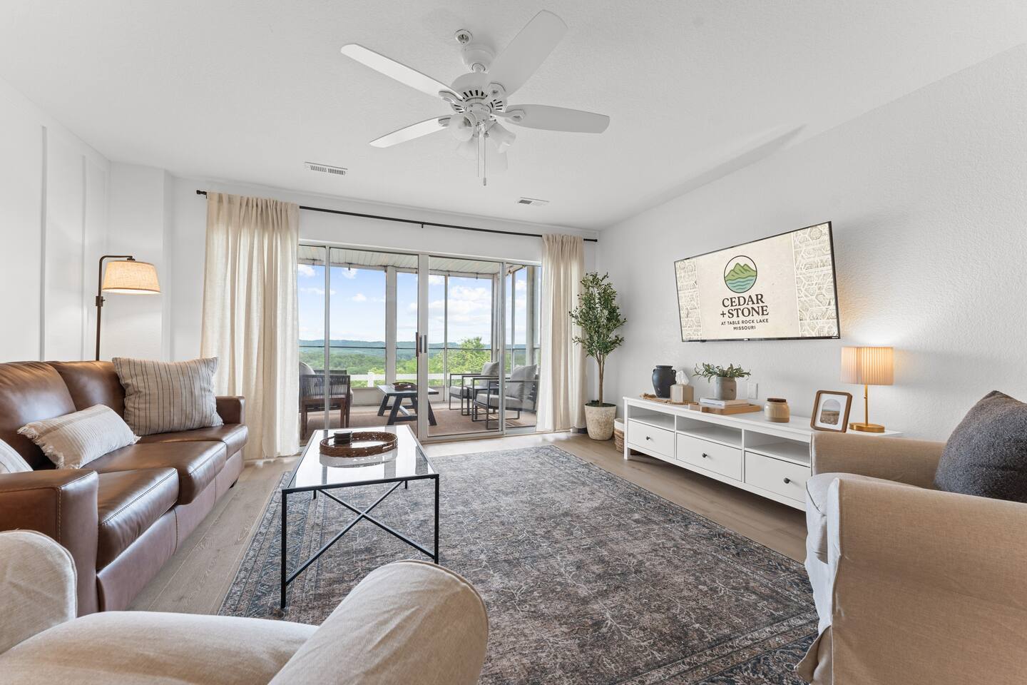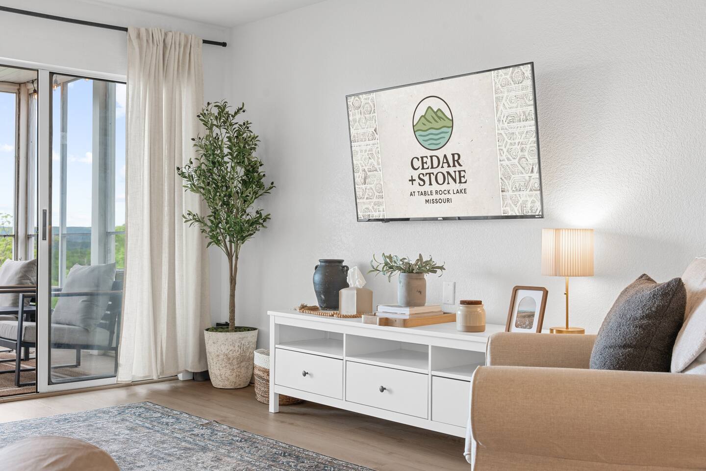 Welcome to Cedar + Stone - a modern lakefront retreat nestled in the Ozark Mountains at Table Rock Lake on the Missouri - Arkansas boarder. This serene and stylish 2-bedroom, 2-bath condo has been thoughtfully designed to feel like your own personal escape. Both bedrooms feature plush king-size beds, and the spacious living area includes a queen sleeper sofa to comfortably accommodate up to six guests. Whether you're sipping coffee on the screened-in patio or winding down with a movie on the smart TV, you’ll feel right at home. Inside, you’ll find a fully stocked kitchen, a cozy dining nook, a dedicated workspace, and tasteful modern finishes throughout. The condo is located in a peaceful building within the Ozark Mountain Resort community, giving you access to resort-style amenities including a seasonal outdoor pool, pickleball courts, mini golf, walking trails, and lake access just a short walk away. Cedar + Stone is ideal for families, couples, or friends looking to unwind in nature without sacrificing comfort. With Branson’s entertainment, shopping, and dining just 25 minutes away, you can enjoy the perfect balance of adventure and relaxation. Whether you’re here for lake days, cozy nights, or a little bit of both - we can’t wait to host your stay.