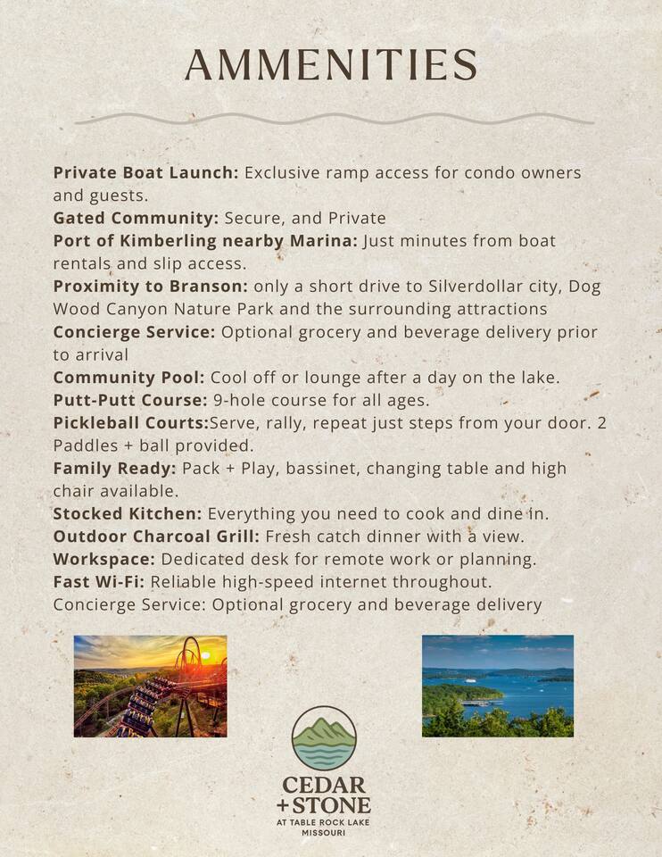 Experience lakeside luxury at Cedar + Stone. This newly remodeled 2BR condo, nestled in the Ozark Mountains, overlooks Table Rock Lake. Enjoy a private boat launch with boat/trailer parking, resort-style amenities including pool, hot tub, pickleball, 9-hole putt-putt, and trails. Perfect for families or adventurous getaways. Start your day with coffee on the patio, indulge in lake activities, or explore nearby attractions. Features fast Wi-Fi, smart TV, full kitchen, and washer/dryer.